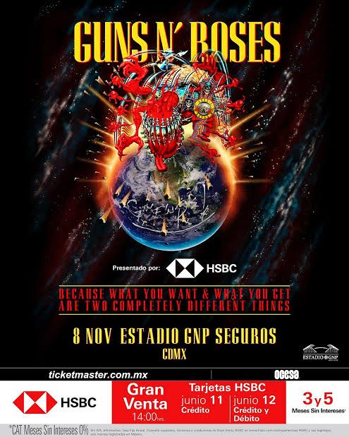 Los boletos para Guns N’ Roses ya se encuentran a la venta a través de Ticketmaster en México. Los precios oscilan desde los dos mil 915 pesos en entrada General A hasta los cinco mil 355 en la denominada Zona GNP.
