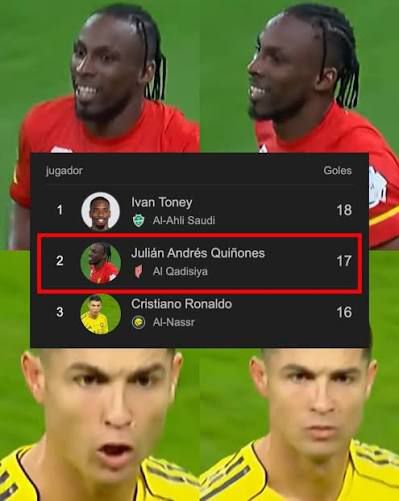 El ariete marcó un nuevo tanto con su equipo el Al Qadisiya para superar al portugués y estrella internacional Cristiano Ronaldo en la contienda por el título de goleo del torneo de Arabia Saudita. Quiñones, de origen colombiano y naturalizado maexicano, llegó a 17 tantos después de 18 jornadas en la Saudí Pro, con lo cual rebasó a Ronaldo -quien tiene 16 bajo el escudo del AL Nassr- y se ubicó en el segundo escalón de la tabla de goleo, que es liderada por el británico Ivan Toney (18), delantero del Al Ahli.