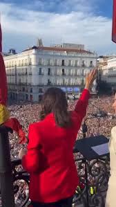 Minutos después del acto institucional, la dirigente salió al balcón de la sede del Gobierno autonómico junto a Isabel Díaz Ayuso para saludar a los asistentes congregados en la Puerta del Sol, donde reiteró el mensaje de “regreso a casa”.