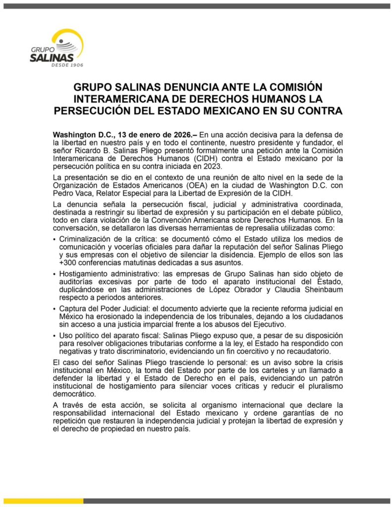 El consorcio empresarial Grupo Salinas informó que presentó una petición formal ante la Comisión Interamericana de Derechos Humanos (CIDH) en contra del Estado mexicano. La denuncia, encabezada por el presidente y fundador del grupo, Ricardo Salinas Pliego, acusa una estrategia de “persecución política” que habría iniciado en el año 2023.