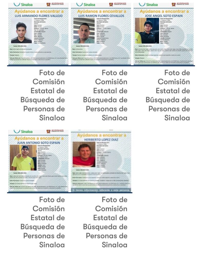La Comisión Estatal de Búsqueda de Personas de Sinaloapublicó las fichas de búsqueda por medio de sus redes sociales. Los nombres de las personas desaparecidas son: